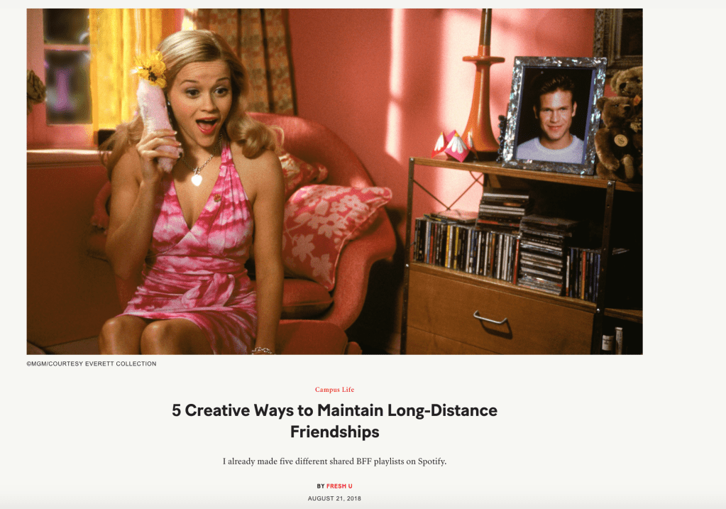 For three years, I pitched and wrote articles for Fresh U, an online publication for college students and partnered with Teen Vogue. From Berkeley protests and maintaining long distance friendships to interviewing political meme pages and researching Mark Zuckerberg’s Congress Testimony, my work at Fresh U was challenging but provided a foundation for my writing and communication skills. I had the opportunity to communicate with a team nationwide, uphold strict deadlines, and work on articles for my peers that aligned with my passion of entertainment and politics.
